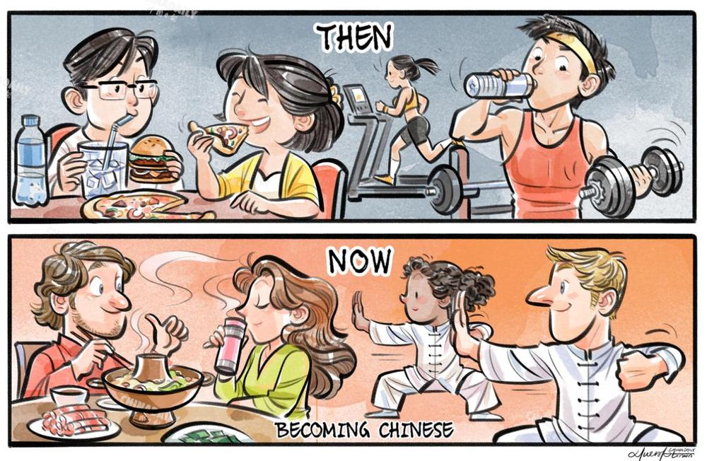 为中国人”风潮表洋胀起“成,练“时刻”、吃暖锅表国人滥觞喝热水、。中国日报 李旻(漫画作家:)
